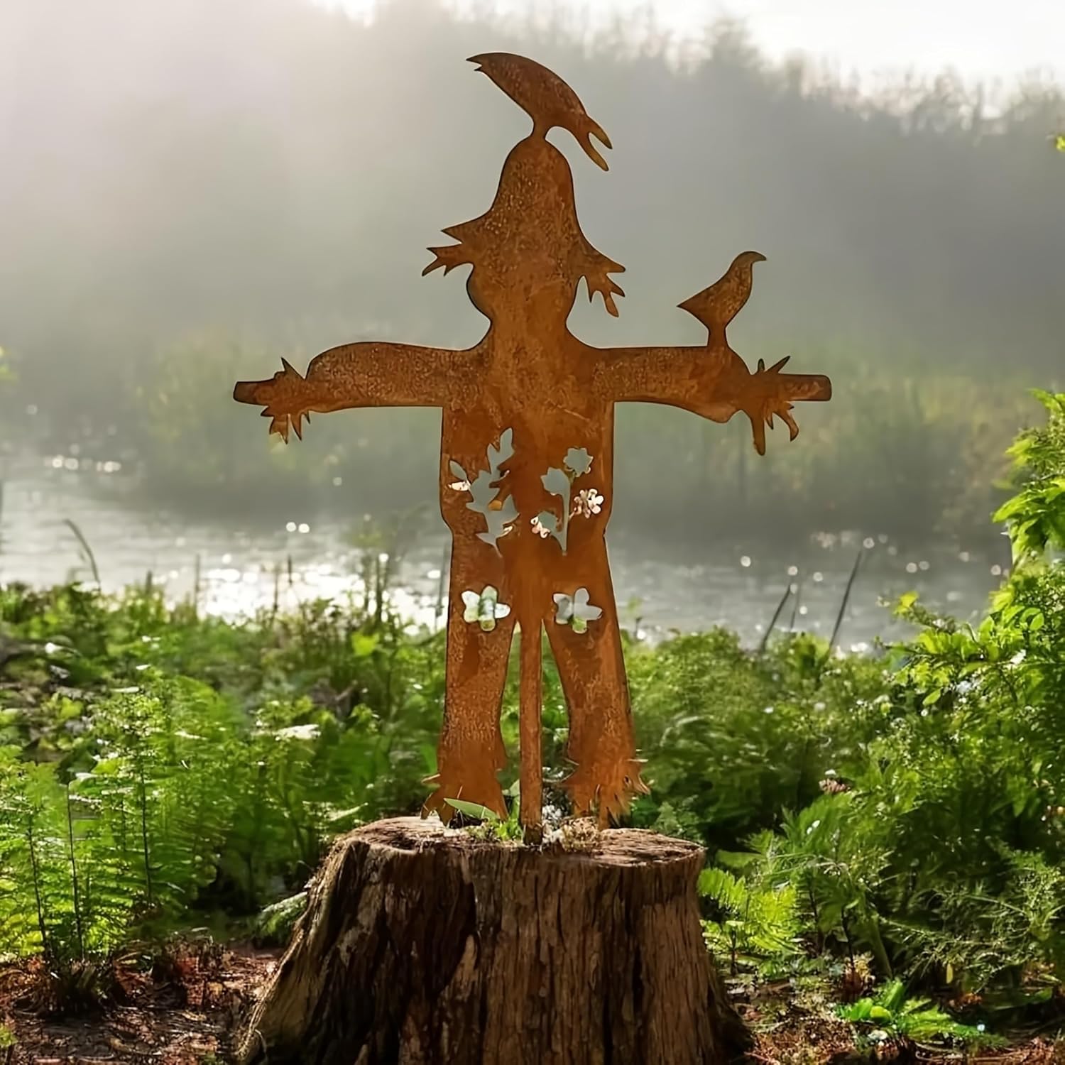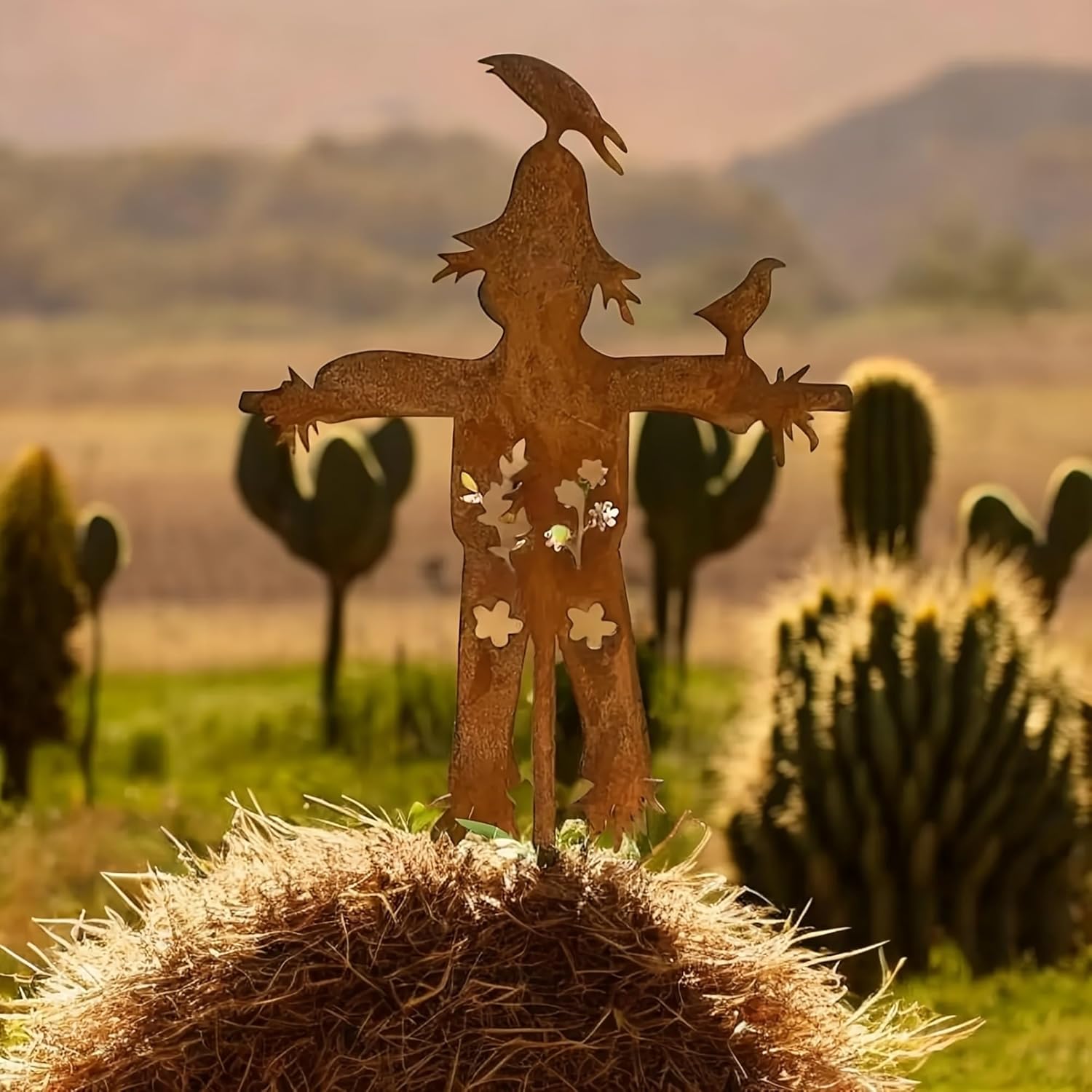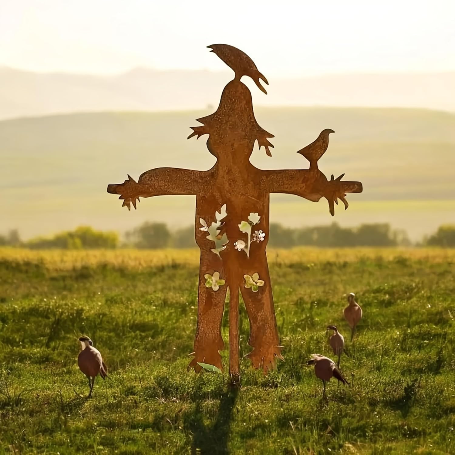 The scarecrow's spherical head is crowned with a pointed hat, featuring a delightful resting bird perched on top. This clever design infuses the sculpture with a sense of vitality and whimsy, making it a captivating point in any outdoor setting. The outstretched limbs warmly welcome every visitor with open arms.