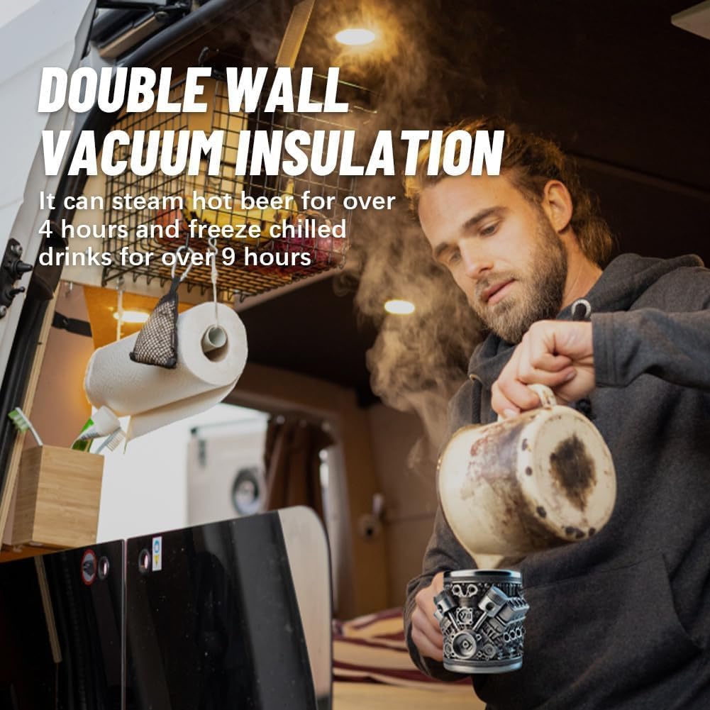 Made from 18/8 armored stainless steel, this mug laughs at dents, scratches, and garage chaos. Double-wall insulation keeps coffee hot for 6+ hours (or beer icy for 12+)—perfect for late-night rebuilds or sunrise cruises.